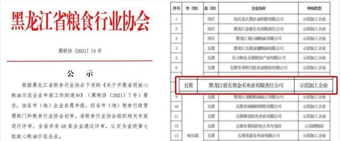 五常金禾米業(yè)被認(rèn)定為省級第七批放心糧油示范企業(yè)